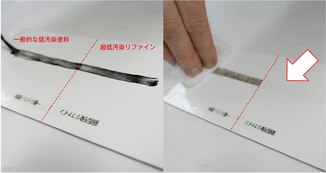 一般的な低汚染塗料と超低汚染リファインを塗った台紙に、