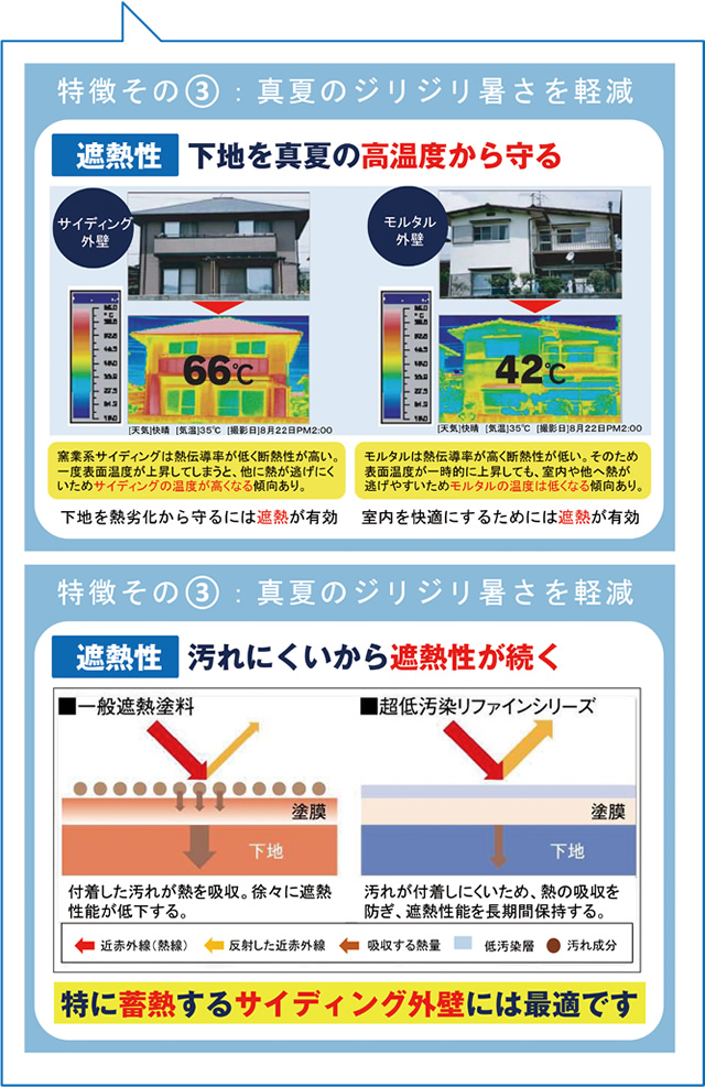 もう1ついい点として、超低汚染リファインは熱を反射する塗料なので、暑さ対策にもなるんです。