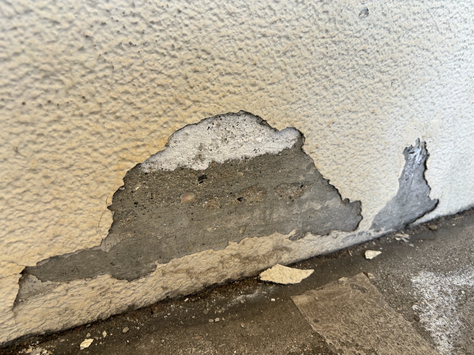 ひび割れにより塗膜とコンクリートが爆裂しています。