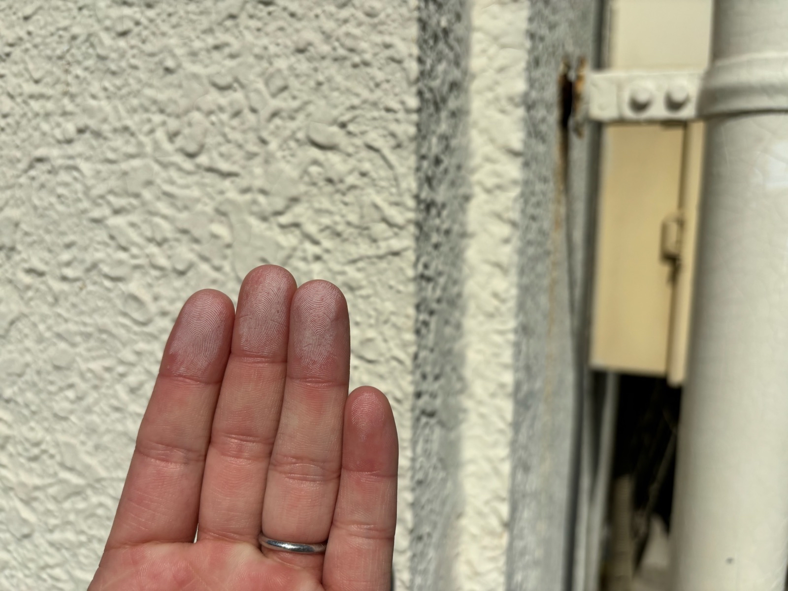 旧塗膜が、紫外線・水分等によって塗膜樹脂が分解し、塗膜表面が粉状になる状態。