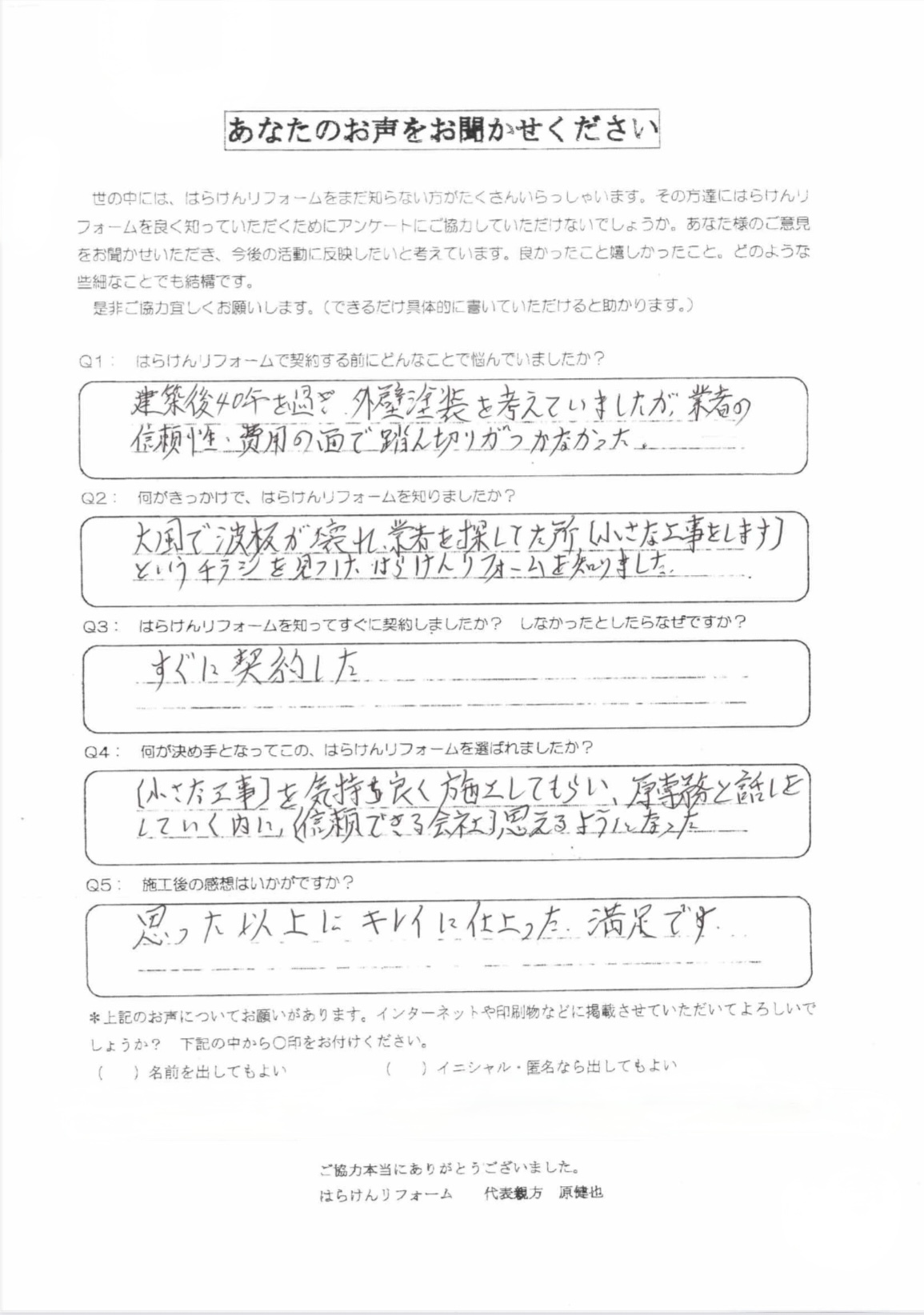 建築後40年を過ぎ、外壁塗装を考えていましたが、業者の信頼性・費用の面で踏ん切りがつかなかった。
