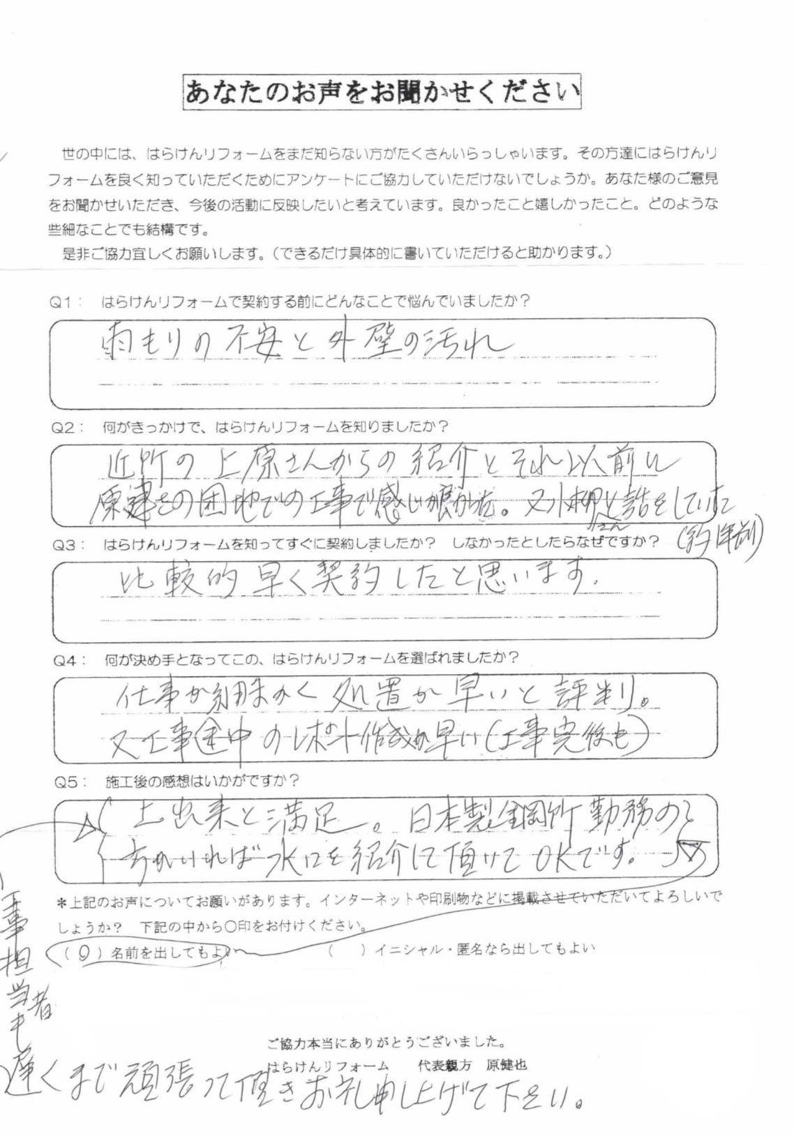 近所の上原さんからの紹介とそれ以前に原建との団地での工事で感じが良かった。又、小柳さんと話をしていた(約1年前)